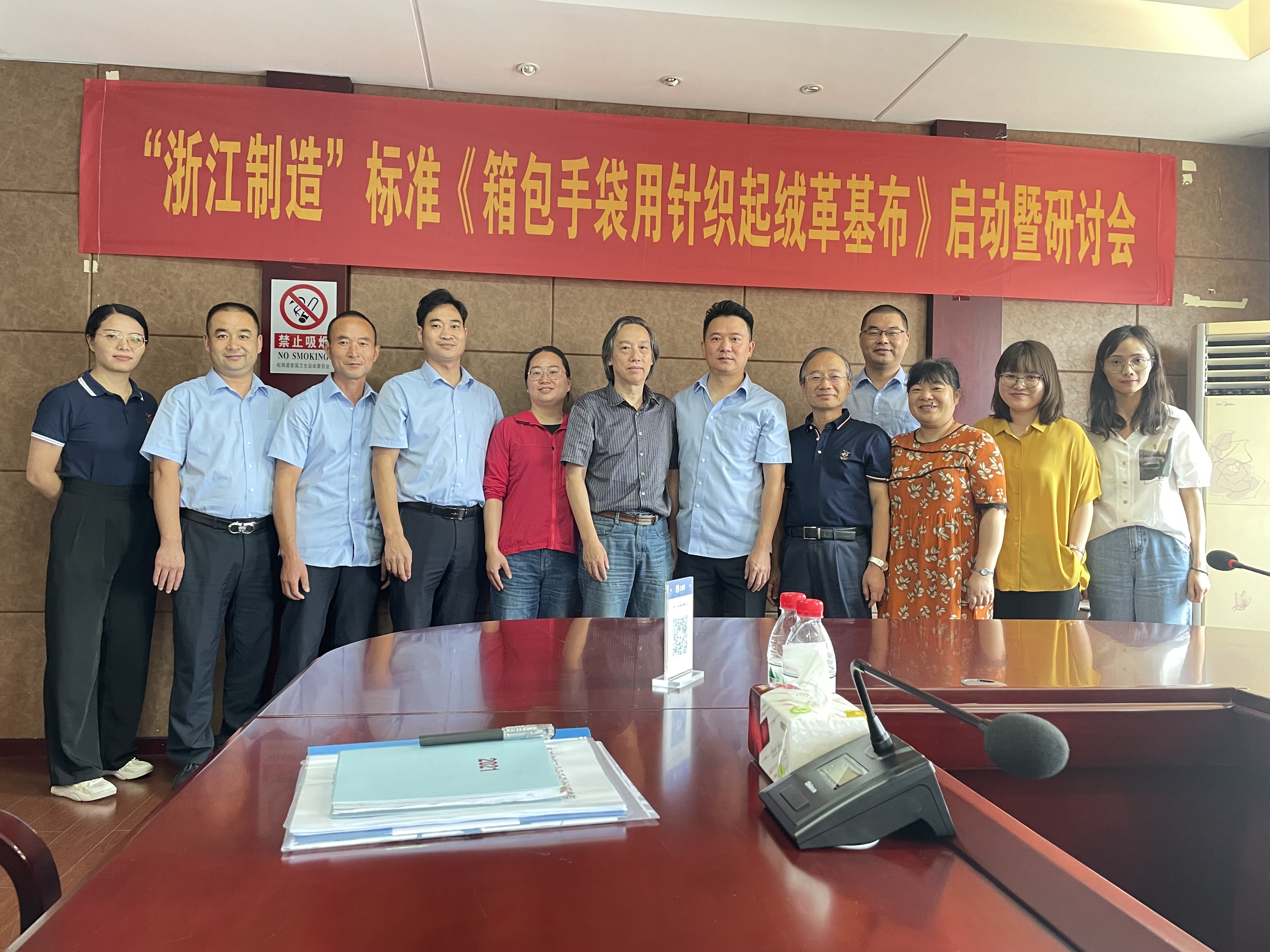浙江省印染協會楊志清秘書長、浙江理工大學祝成炎教授、浙江省輕工業品質量檢驗研究院高級工程師曹麗勤等專家和云中馬股份有限公司及旭峰布業代表一起圍繞《箱包手袋用針織起絨革基布》“浙江制造”標準要求進行研討。